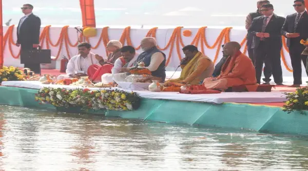 यहां से पीएम सीधे संगम नोज पर बने पंडाल में पहुंचे। यहां उपस्थित तीर्थ पुरोहितों ने उन्हें आसन ग्रहण कराया। पीएम के अगल-बगल में सीएम योगी और राज्यपाल आनंदीबेन पटेल ने भी आसन ग्रहण किया। इसके बाद तीर्थ पुरोहितों के वैदिक मंत्रोच्चारण के बीच पीएम मोदी ने पूजा अर्चना की। तीर्थ पुरोहितों ने उनसे आचमन भी कराया। पीएम मोदी ने खड़े होकर त्रिवेणी का जलाभिषेक और दुग्धाभिषेक किया। पीएम मोदी, सीएम योगी और राज्यपाल ने अक्षत, चंदन, रोली और पुष्पमाला के साथ ही त्रिवेणी में वस्त्र भी अर्पित किया। इसके बाद पीएम ने संगम आरती भी की। अंत में पीएम मोदी ने विशेष रूप से सजाए गए प्रांगण में फोटोशूट भी कराया। इस ऐतिहासिक कार्यक्रम के दौरान उत्तर प्रदेश के उप मुख्यमंत्री केशव प्रसाद मौर्य, ब्रजेश पाठक और मुख्य सचिव मनोज कुमार सिंह भी मौजूद रहे।