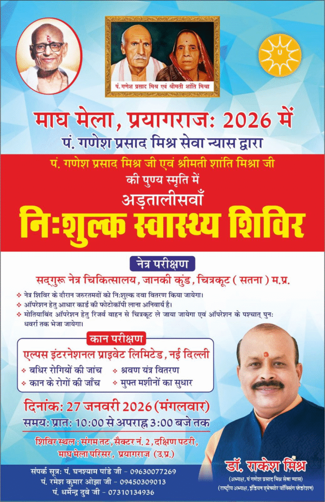 Prayagraj प्रयागराज। माघ मेला 2026 के पावन अवसर पर पं. गणेश प्रसाद मिश्र सेवा न्यास द्वारा पं. गणेश प्रसाद मिश्र जी एवं श्रीमती शांति मिश्र जी की पुण्य स्मृति में 48वाँ निःशुल्क स्वास्थ्य शिविर का आयोजन किया जा रहा है। यह जनसेवा आधारित शिविर श्रद्धालुओं, कल्पवासियों एवं मेला क्षेत्र में आने वाले आम नागरिकों के स्वास्थ्य संरक्षण हेतु समर्पित है।