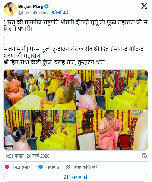 - श्रद्धा भाव: राष्ट्रपति ने महाराज जी के सरल जीवन, उनकी अडिग भक्ति और उनके द्वारा दिए जाने वाले आध्यात्मिक उपदेशों के प्रति अपनी गहरी श्रद्धा व्यक्त की।