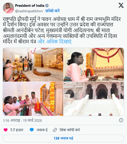 बता दें कि राष्ट्रपति द्रौपदी मुर्मू गुरुवार को अयोध्या धाम के दौरे पर थीं, जहाँ उन्होंने: