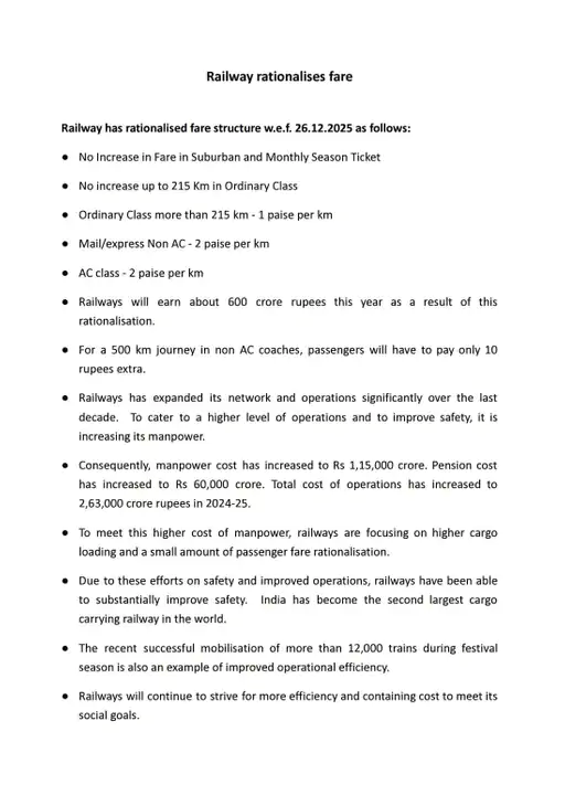 रेलवे मंत्रालय के अनुसार, ईंधन, रखरखाव और संचालन से जुड़ी लागत लगातार बढ़ रही है, जिसे संतुलित करने के लिए किराए में संशोधन जरूरी था।