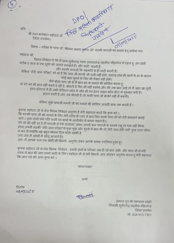 रायसेन: कलेक्ट्रेट में जनसुनवाई के दौरान एक अनोखा आवेदन सबका ध्यान खींच लाया। गोहरगंज तहसील के हेमंत मांझी ने प्रशासन से अपनी प्रेमिका परीक्षा से शादी कराने की मांग की।