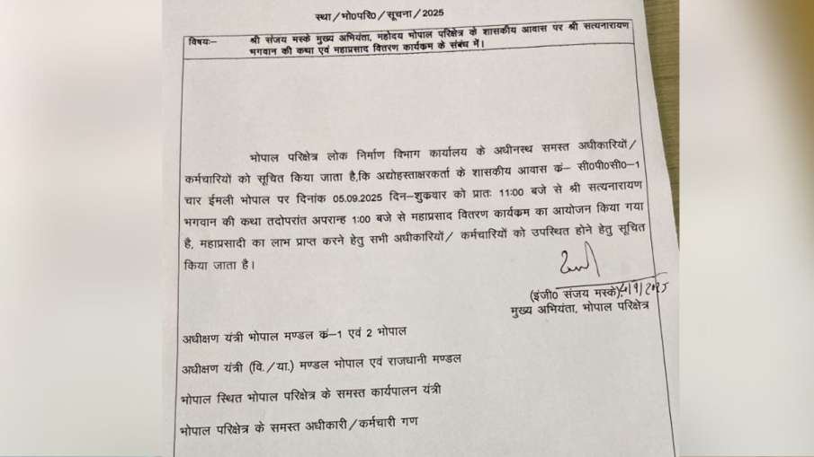 मामला लोक निर्माण विभाग (PWD) का है। भोपाल रीजन में तैनात चीफ इंजीनियर संजय मस्के ने 5 सितंबर को अपने सरकारी बंगले (सीपीसी-1, चार इमली, भोपाल) पर सत्यनारायण कथा का आयोजन किया था। इस अवसर पर दोपहर 1 बजे से महाप्रसाद वितरण भी रखा गया था।