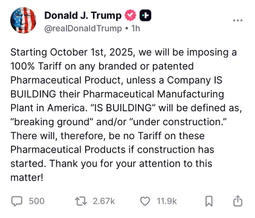 अमेरिकी राष्ट्रपति डोनाल्ड ट्रम्प ने ब्रांडेड या पेटेंटेड दवाओं पर 100% टैरिफ लगाने की घोषणा की है। यह नया टैरिफ 1 अक्टूबर 2025 से लागू होगा। हालांकि, उन कंपनियों पर यह टैक्स नहीं लगेगा, जो अमेरिका में अपनी दवा बनाने की फैक्ट्री का निर्माण कर रही हैं।