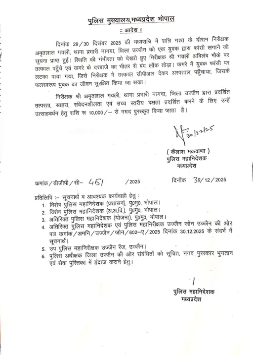 Ujjain news: जिले के नागदा में इंसानियत और पुलिस की तत्परता की मिसाल देखने को मिली, जब थाना प्रभारी ने फंदे से लटके युवक की जान बचा ली। मौके पर पहुंचकर टीआई ने न सिर्फ युवक को नीचे उतारा, बल्कि लगातार सीपीआर देकर उसकी सांसें वापस लौटा दीं। इस सराहनीय कार्य पर पुलिस महानिदेशक ने इनाम देने की घोषणा की है।