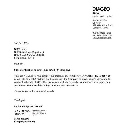 United Spirits ने साफ कर दिया है कि RCB को बेचने की कोई योजना नहीं है। टीम की हालिया IPL जीत और बढ़ी हुई ब्रांड वैल्यू के बावजूद, कंपनी ने इन अटकलों को सिरे से नकार दिया है।