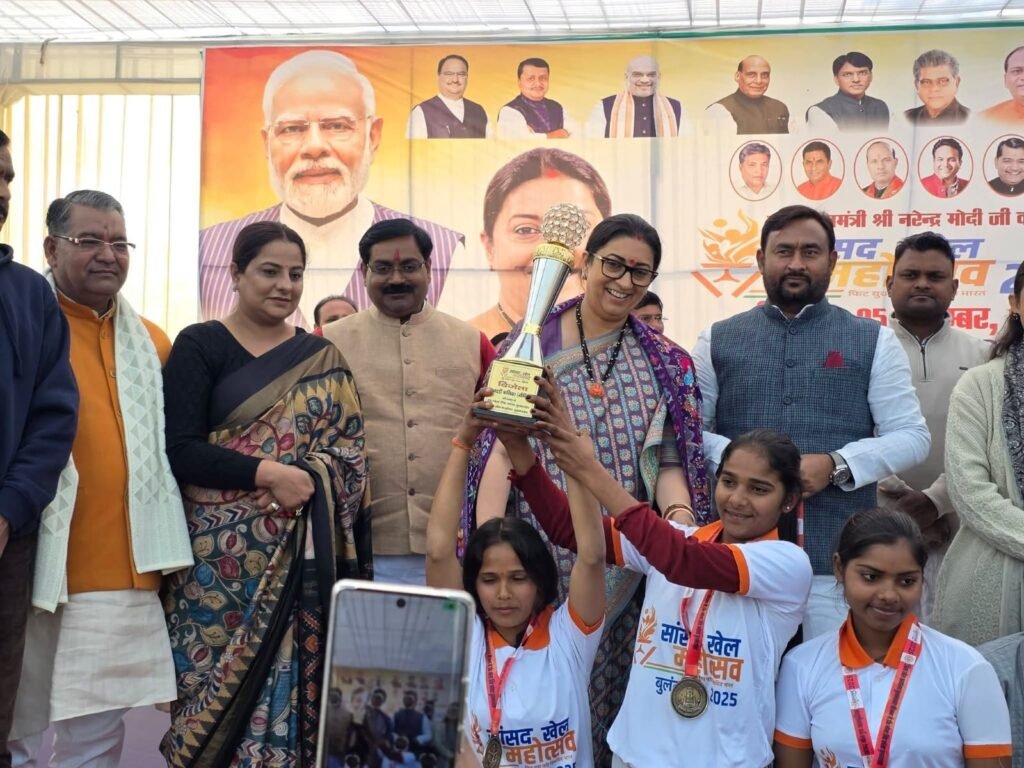 UP news: जनपद बुलंदशहर के जहांगीराबाद क्षेत्र स्थित खालौर स्टेडियम में आयोजित सांसद खेल महोत्सव 2025 के समापन कार्यक्रम का भव्य आयोजन किया गया। कार्यक्रम की मुख्य अतिथि पूर्व केंद्रीय मंत्री स्मृति ईरानी रहीं। कार्यक्रम की अध्यक्षता भाजपा जिला अध्यक्ष विकास चौहान ने की, जबकि संचालन शंभू सिंह राघव द्वारा किया गया।