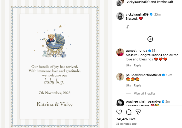 सोशल मीडिया पर “#KatrinaVickyBabyBoy” ट्रेंड करने लगा है और सभी उन्हें ढेर सारा प्यार और शुभकामनाएं भेज रहे हैं।