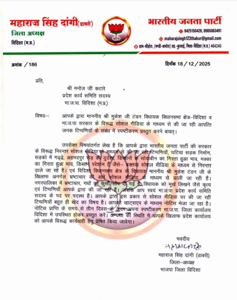 Vidhisha News:: भारतीय जनता पार्टी विदिशा इकाई में एक बार फिर सियासी हलचल तेज हो गई है। गुरुवार शाम भाजपा जिला अध्यक्ष महाराज सिंह दांगी डाबरी द्वारा प्रदेश कार्य समिति सदस्य मनोज कटारे को जारी किए गए नोटिस के सोशल मीडिया पर वायरल होते ही जिले की राजनीति में उथल-पुथल मच गई है।
