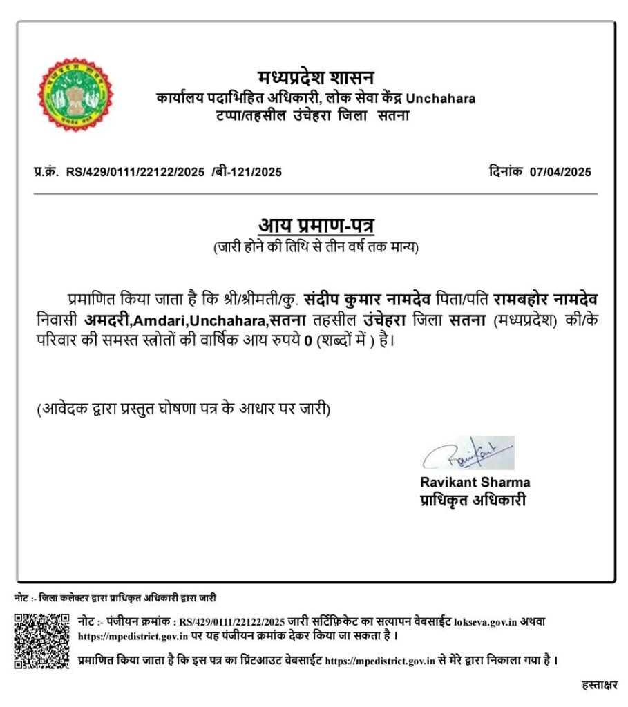 सतना, मध्यप्रदेश | मध्यप्रदेश के सतना जिले से आई एक के बाद एक दो चौंकाने वाली घटनाओं ने सरकार के आय प्रमाण पत्र जारी करने की प्रणाली पर सवाल खड़े कर दिए हैं। उचेहरा तहसील के अमदारी गांव निवासी संदीप कुमार नामदेव को जारी किया गया आय प्रमाण पत्र देशभर में चर्चा का विषय बन गया है। इस प्रमाण पत्र में उसकी सालाना आय ‘शून्य रुपये’ दर्ज की गई थी।